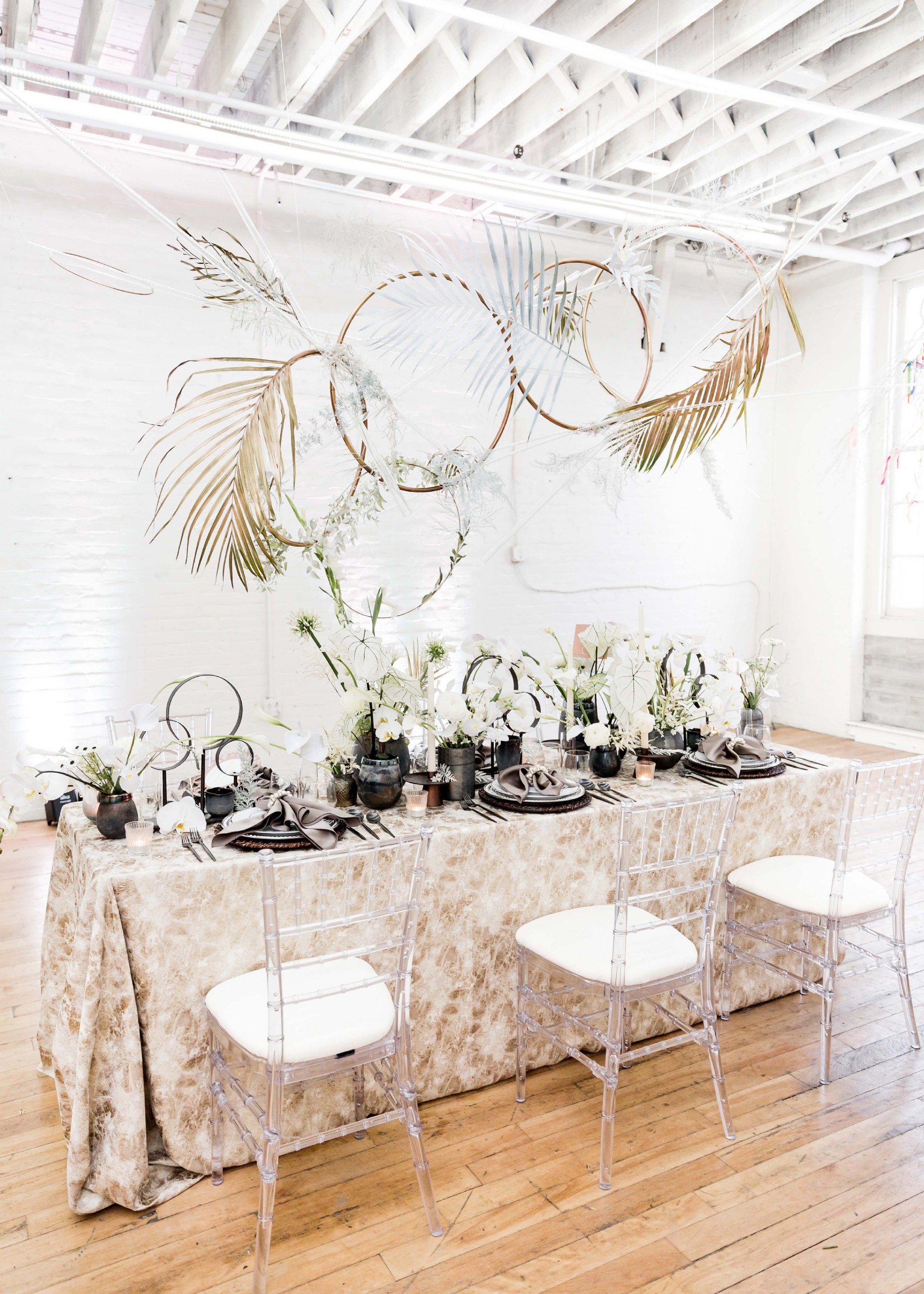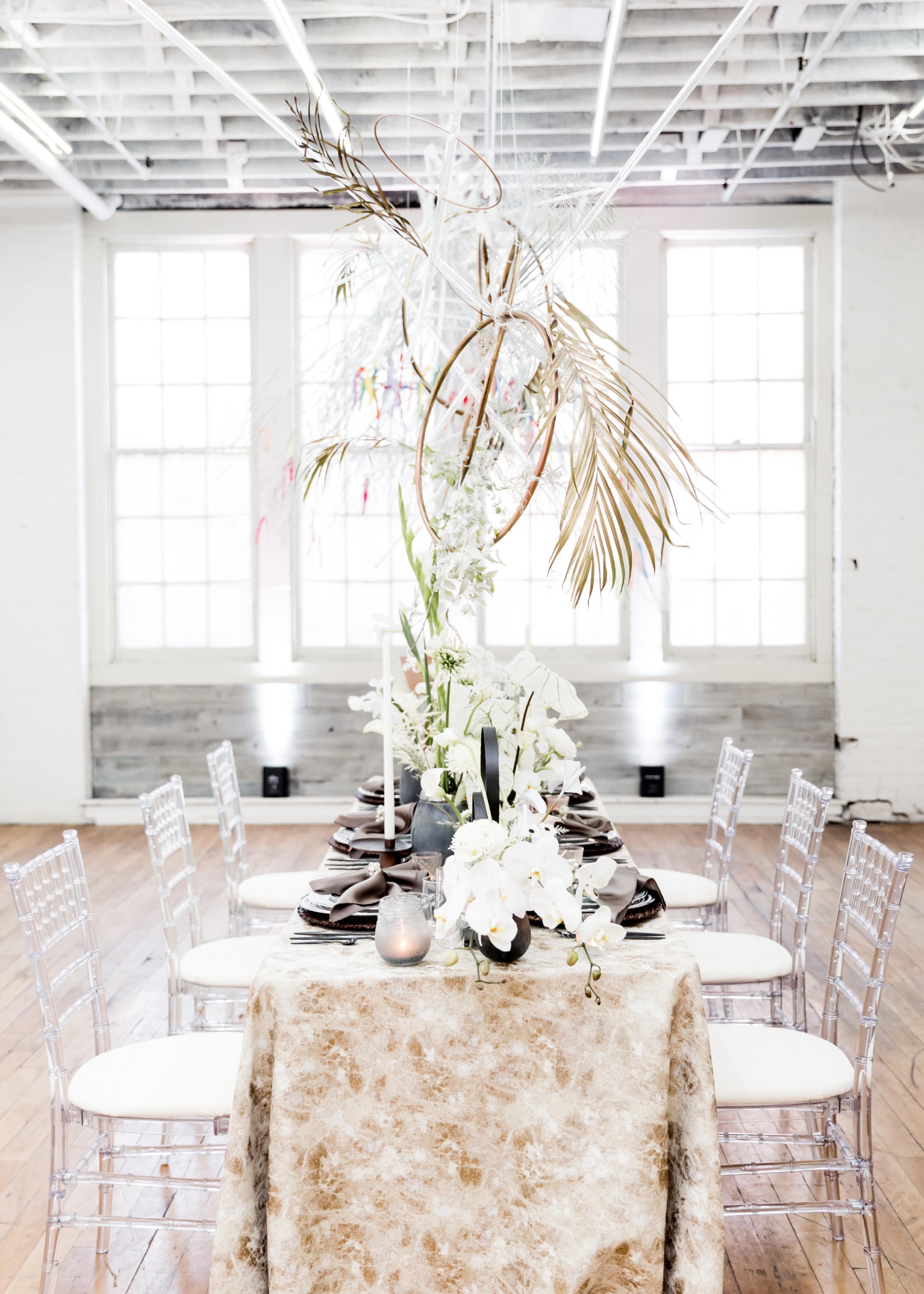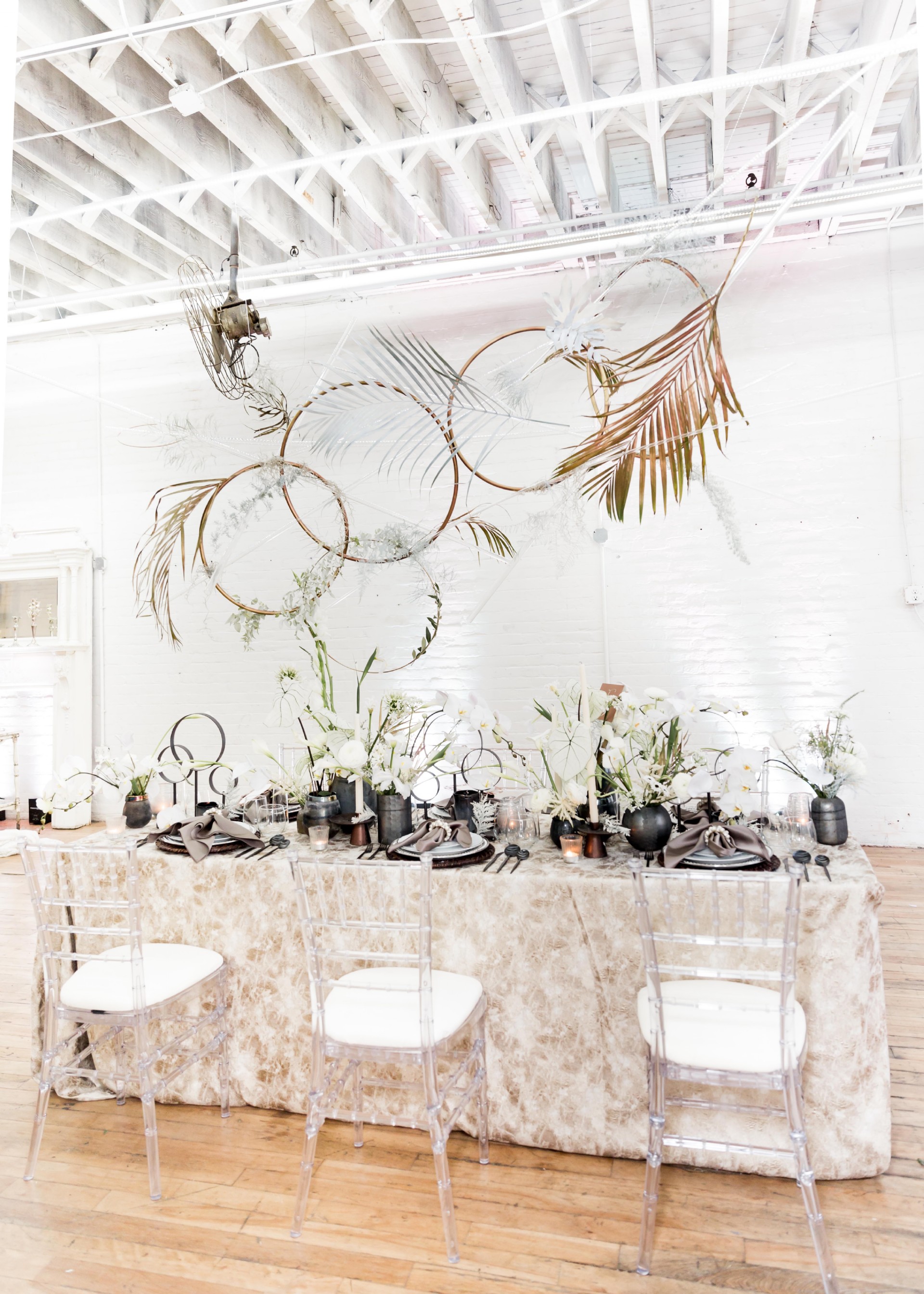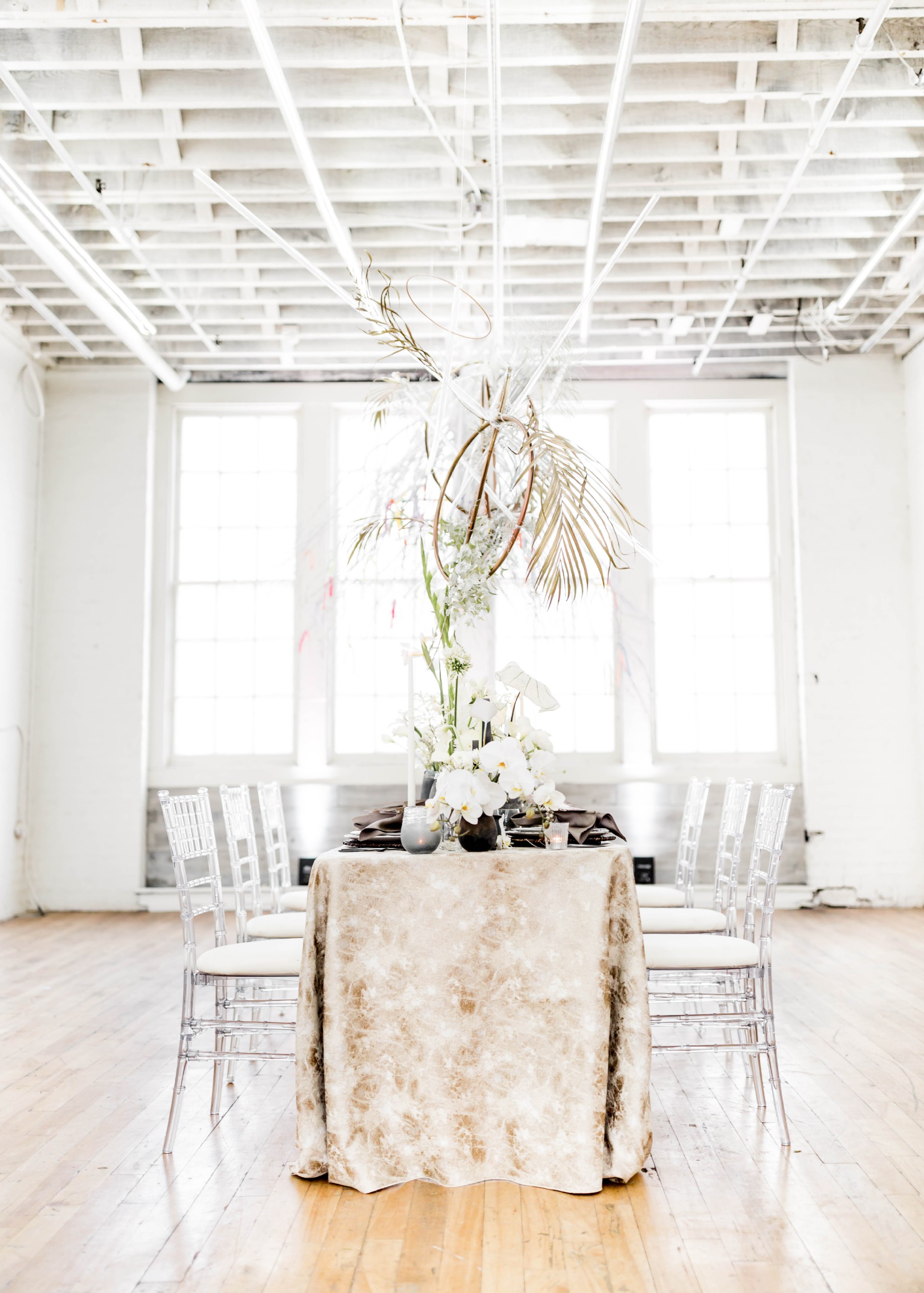 Venue: Hip at Flashlight Factory | Photographer: Sarah Casile Photography | Florist: greenSinner Floral | Stationary: Red Punch Design | Wardrobe: Luna Boutique | Rentals: Eventioneers | Rentals: Vintage Alley Rentals | Lighting: Ever Forward | Cake: Bella Christies | Bridal Accessories: Clarissa Boutique